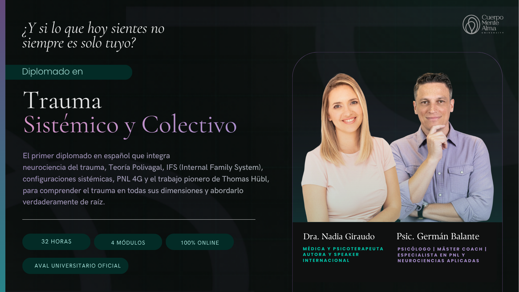 El primer diplomado en español que integra la neurobiología del trauma con sus dimensiones transgeneracional y colectiva. Del sistema nervioso al campo compartido — con herramientas de aplicación inmediata.